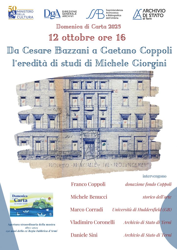 In occasione della Domenica di Carta 2025 in programma il 12 ottobre alle 16, all’Archivio di Stato di Terni si terrà una conferenza dal titolo “Da Cesare Bazzani a Gaetano Coppoli, l’eredità di studi di Michele Giorgini”.